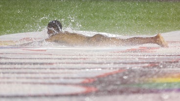 With security officials avoiding the rain, the naked man had free rein, using the infield tarp as his own Slip 'N Slide.