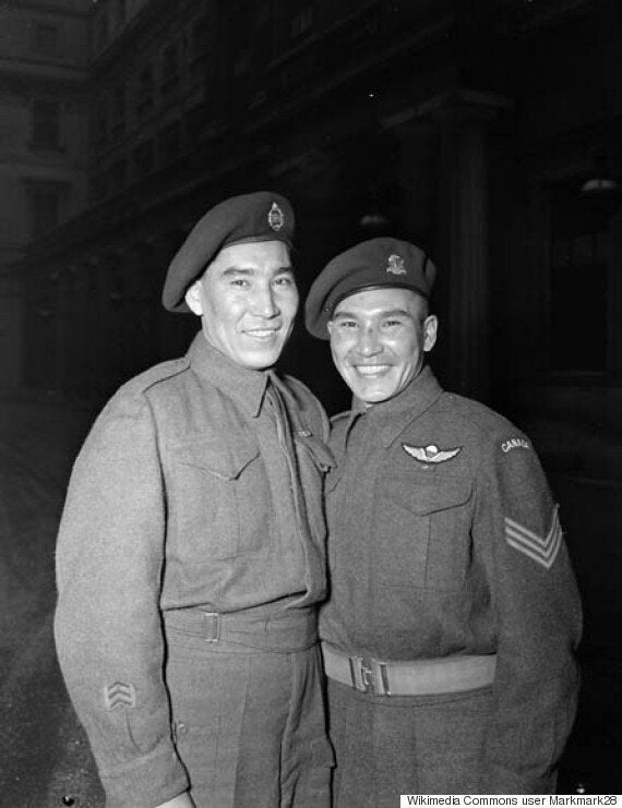 Tommy Prince stands at right, with his brother Morris Prince. (Photo via Wikimedia Commons)