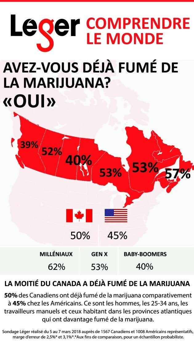 Au Québec, un peu plus de la moitié (53%) des habitants ont déjà consommé de la marijuana. Le plus haut taux de consommation est dans les provinces atlantiques où 57% de la population a déjà fumé du pot.