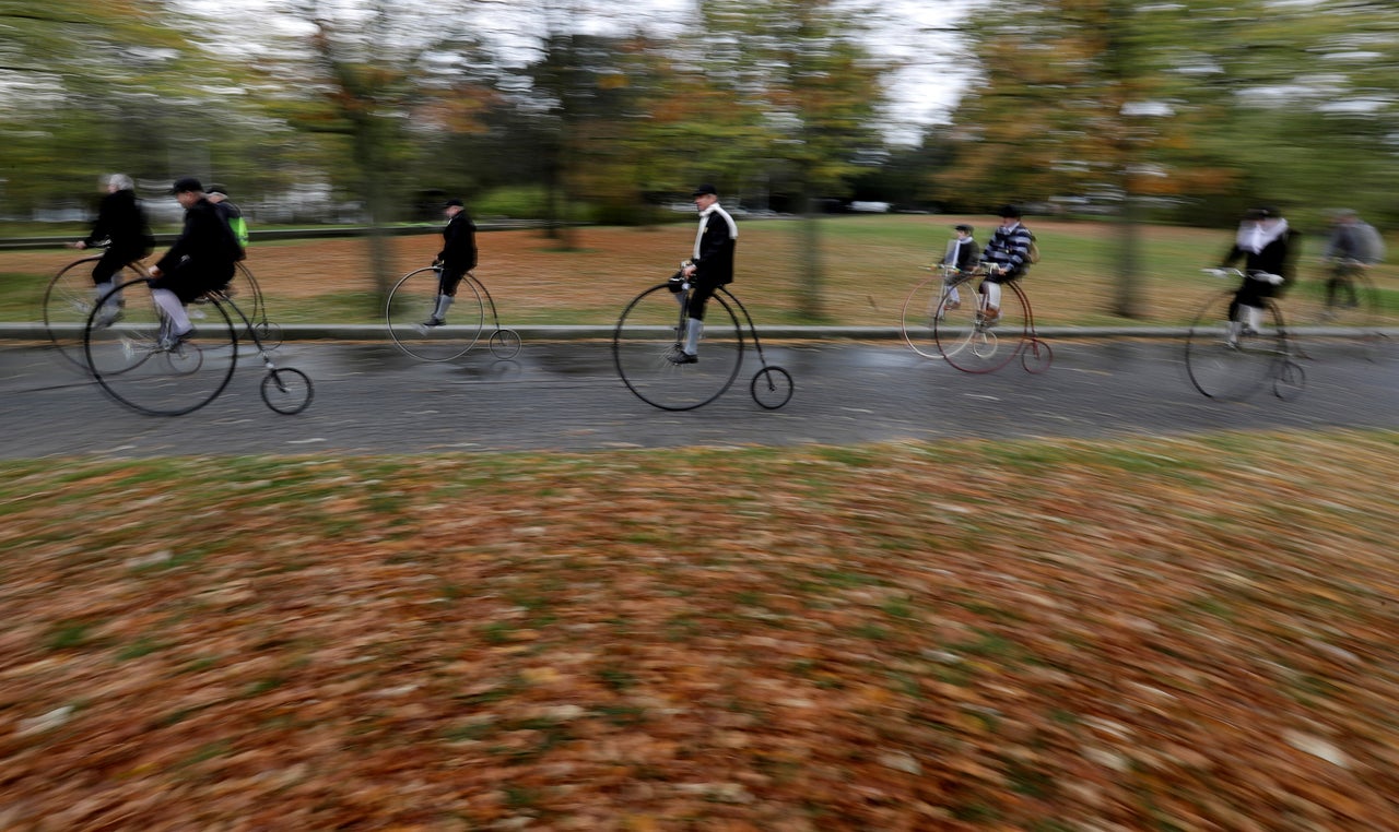 Participants wearing historical costumes ride high-wheel bicycles during the annual penny farthing race in Prague, Czech Republic, on Nov. 2, 2019.