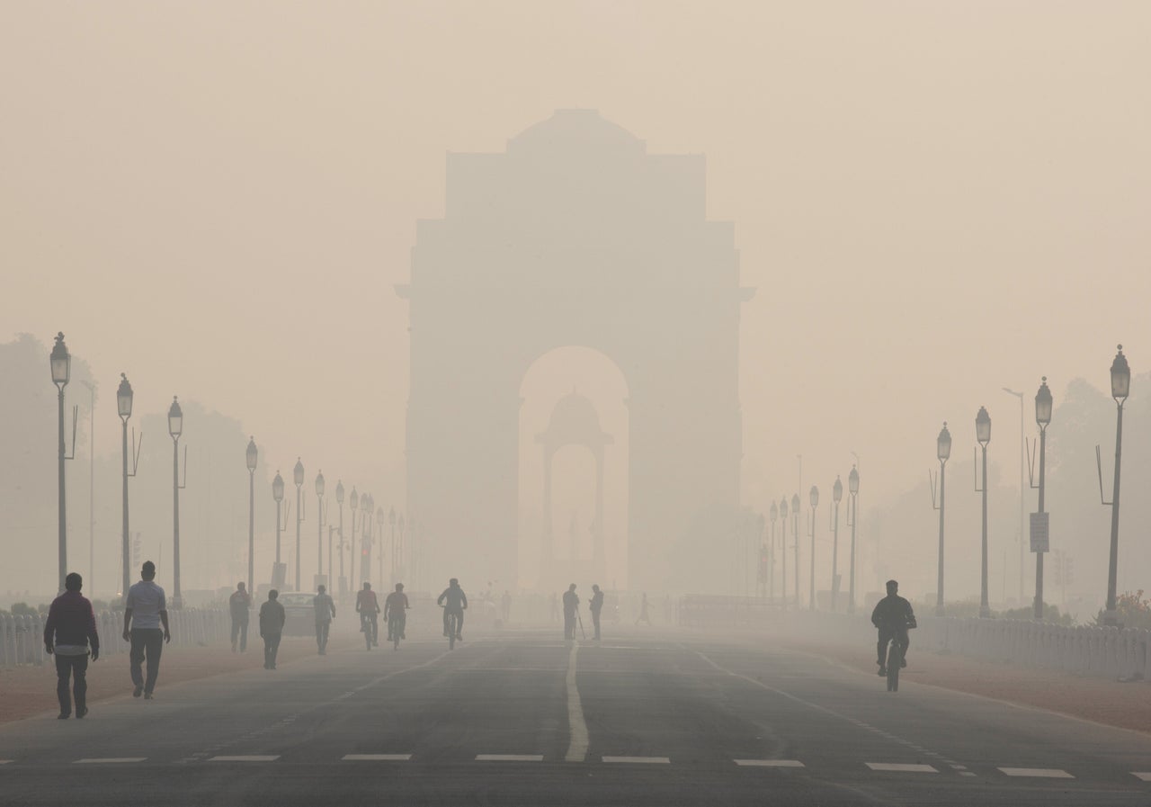 Pedestrians walk along Rajpath boulevard in front of the smog-shrouded India Gate monument in New Delhi on Nov. 5, 2019. Air pollution levels in India’s capital remained at near-record levels, forcing schools to shut down through midweek and keeping residents indoors.