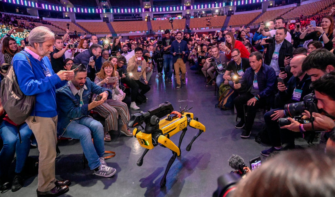 Spot the robot heads toward the Altice Arena stage at Web Summit 2019 in Lisbon, Portugal, on Nov. 7, 2019. Marc Raibert, founder and CEO of Boston Dynamics, was speaking on the future of mobile robots.