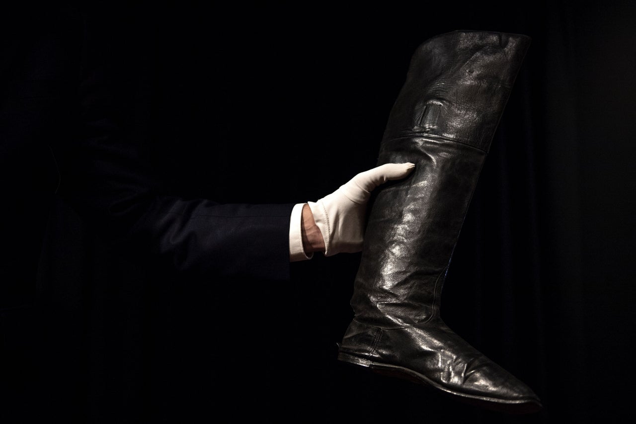 An expert holds a pair of Napoleon I’s riding boots (“bottes a l’ecuyere” in French) at the Drouot auction house in Paris on Nov. 8, 2019, ahead of a sale scheduled for Nov. 29.