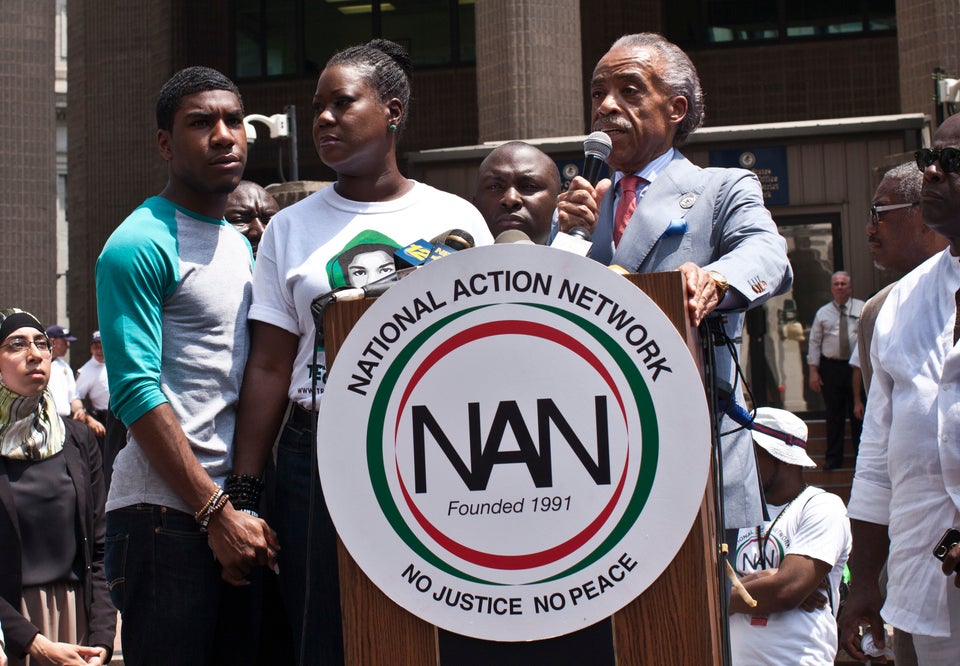 Rev. Al Sharpton speaks as Trayvon Martin's mother Sybrina Fulton and Martin's brother Jahvaris Fulton (left) attend a rally honoring the teenager on July 20. Demonstrators gathered in various cities across the country to protest the acquittal of neighborhood watchman George Zimmerman and press for his federal prosecution in the shooting death of Martin.