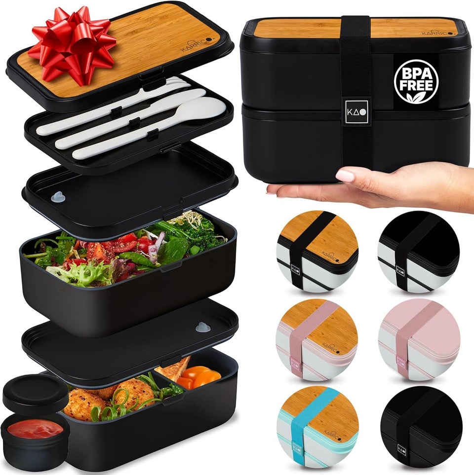 The lunchbox has two main compartments, each with two sections and adjustable dividers for portion control. The leakproof lids have steam vents, and the box is microwave-safe up to three minutes, as well as dishwasher-safe. A utensil set is even included with its own compartment for easy storage. The box is also biocote-protected to reduce odors and stains. You can get it in three colors.