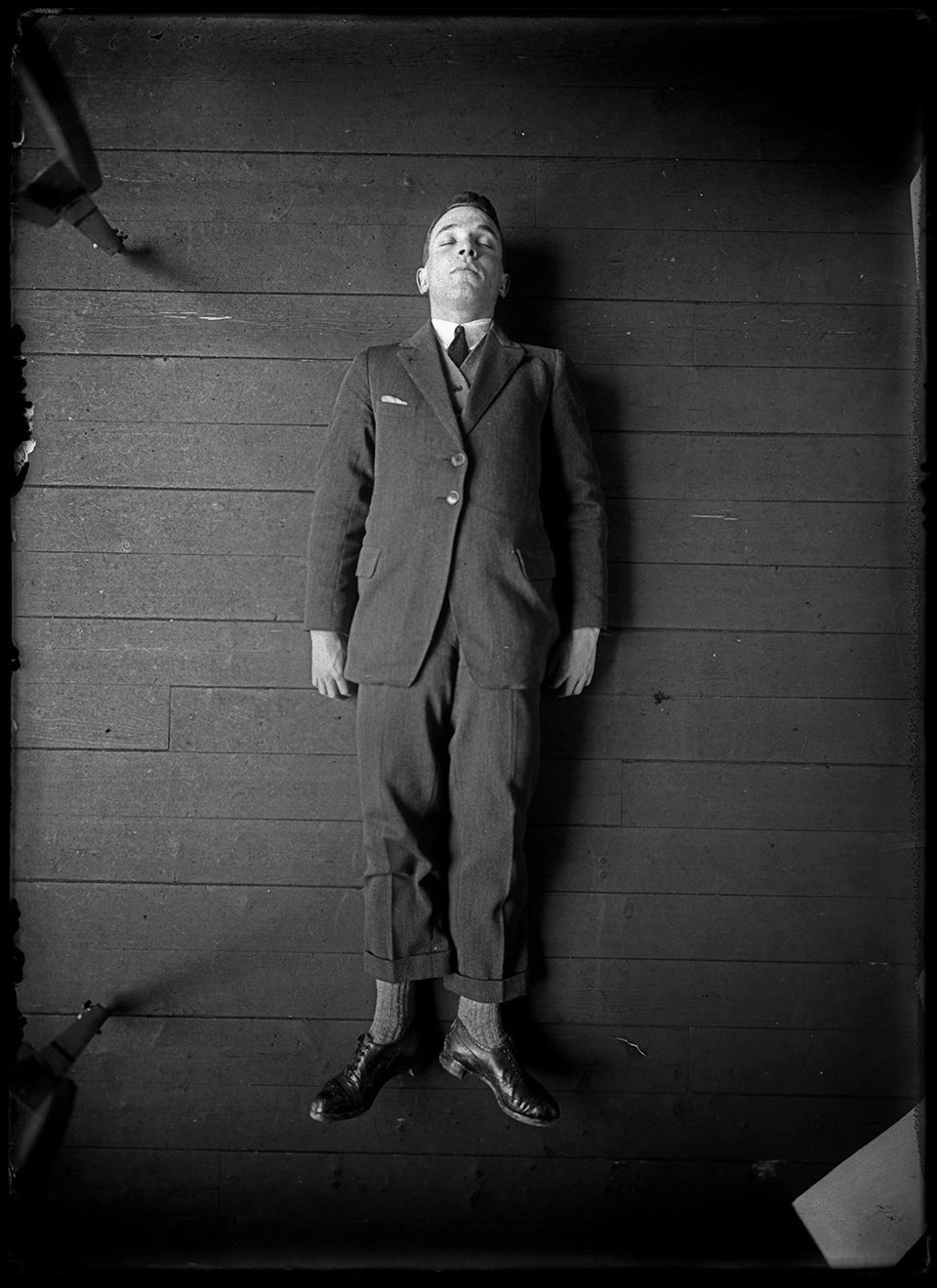 A demonstrative image of Bertillon's forensic photographic approach, with a body simulating a corpse and the camera in position. Used as teaching material for courses and conferences.