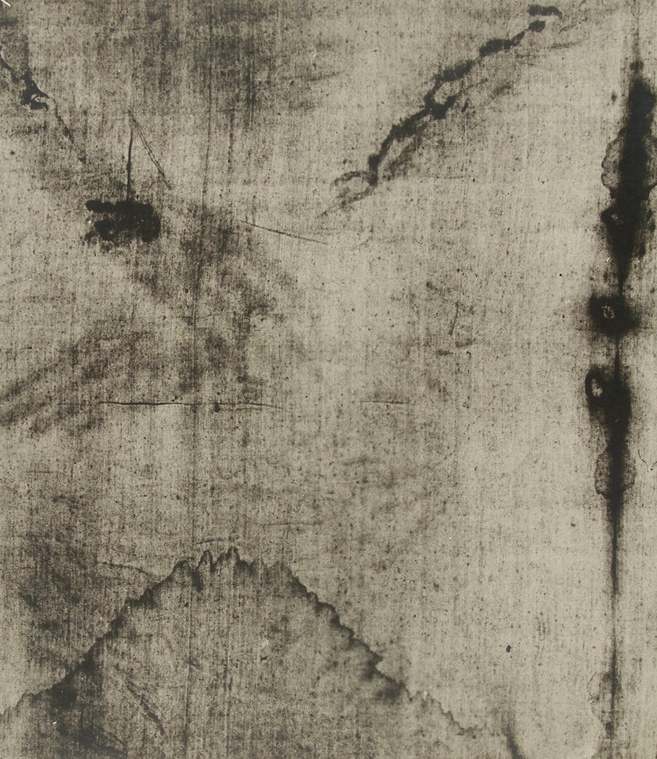 The Shroud of Turin, Turin: face, traces of blood and serum left on the forehead by the crown of thorns. Negative. Image created by enlargement of a cliché by Giuseppe Enrie (1931-1933).