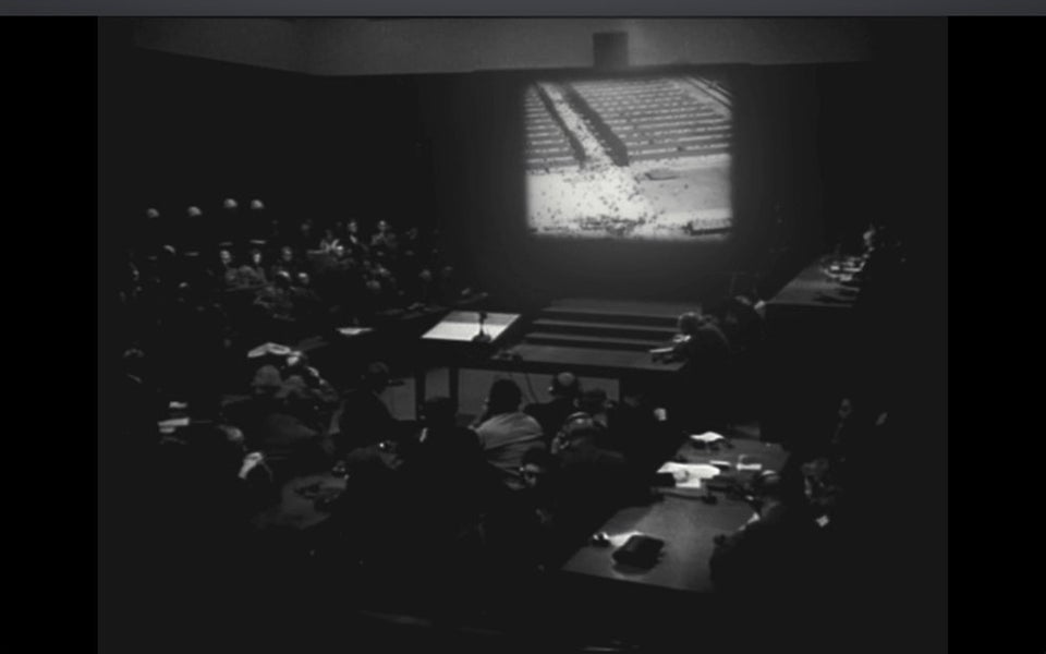 The accused during projection. Photograms taken from the film Nuremberg, les nazis face à leurs crimes, realized by Christian Delage (2006).