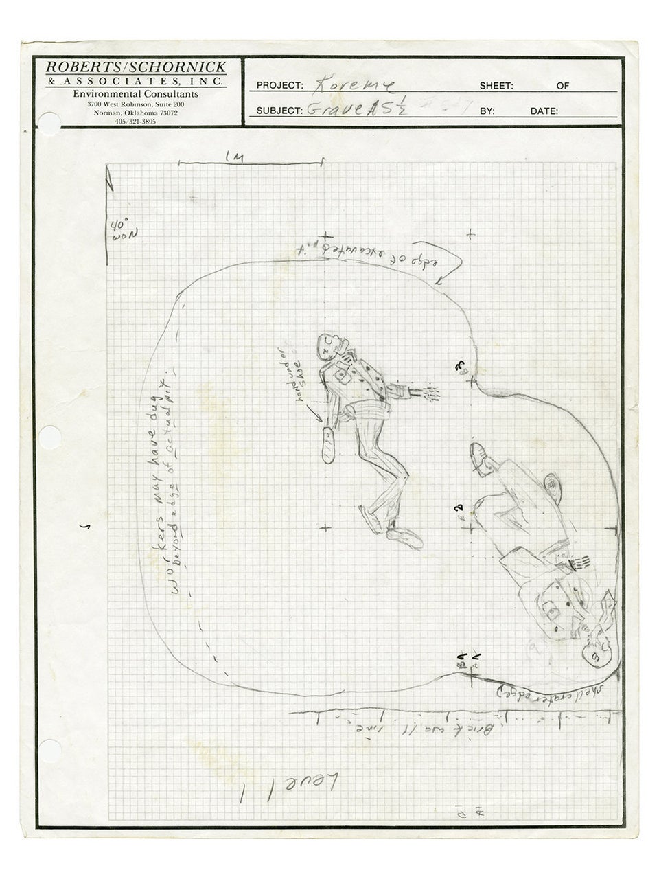 Paper drawing to scale and orientation of graves in A-South, Level 1, archeological team members from the medical-legal squad of the mission, Middle East Watch and Physicians for Human Rights, May-June 1992.