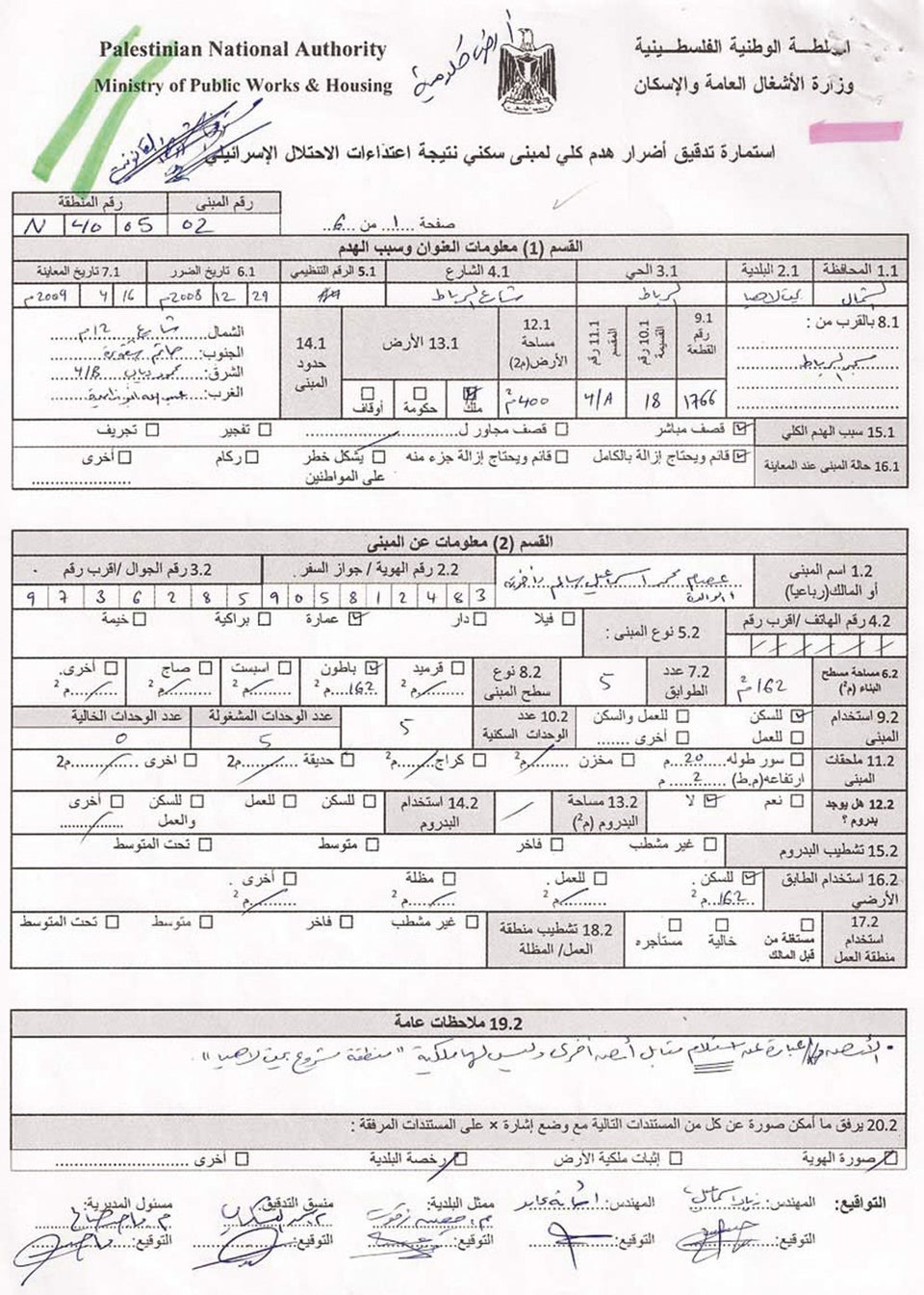 Original page in Arabic of the construction N4005-02 from the archive "Verification of the architectural destruction caused by attacks due to Israeli occupation," 2009.