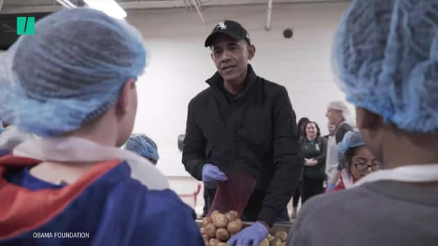 Former President Barack Obama lent a helping hand at a food bank in Chicago on Tuesday.