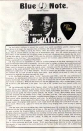 In '93, The Blue Note in New York City advertised "A Rare Club Date With B.B. King." I bought tickets, and Erin and I and some friends showed up early for the first come, first served general admission. We ended up front-row center, directly in front of his eminence. B.B. had his entire 12-piece band with him and it was quite a sight in this small, intimate and fabled New York jazz club. In those days, the Blue Note had mostly jazz quartets and quintets, and they were not equipped to service B.B.'s large band requirements and retinue. In fact, B.B.'s three-piece horn section was relegated to off stage because they could not fit. They played off stage mostly, but when they did a solo, they scurried on, blew a few beautiful notes, and returned to the shadows. The life of a sideman. Not 20 feet from greatness, more like eight...