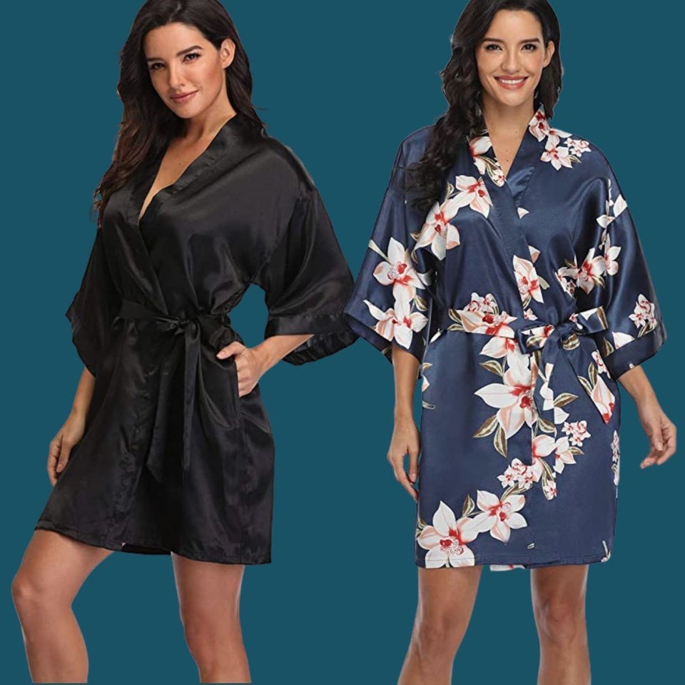 Great for a bridesmaid's gathering or lightweight coverage in summer, this satin robe has roomy quarter-length sleeves, side pockets and an inside tie to keep it securely closed. Available in sizes S-XXL, you can get this robe in an impressive selection of 46 different colors and patterns.