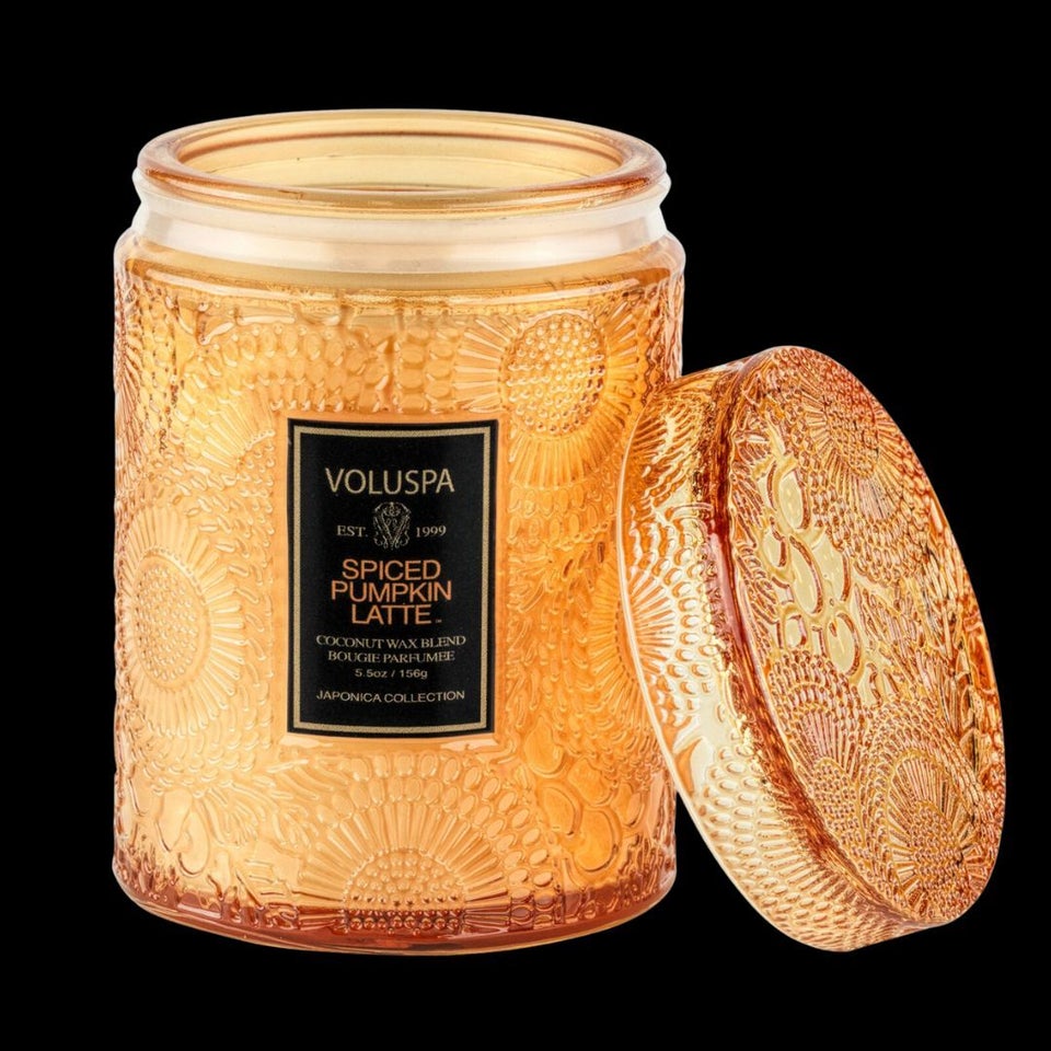 A luxury candle scented like a pumpkin-spice latte