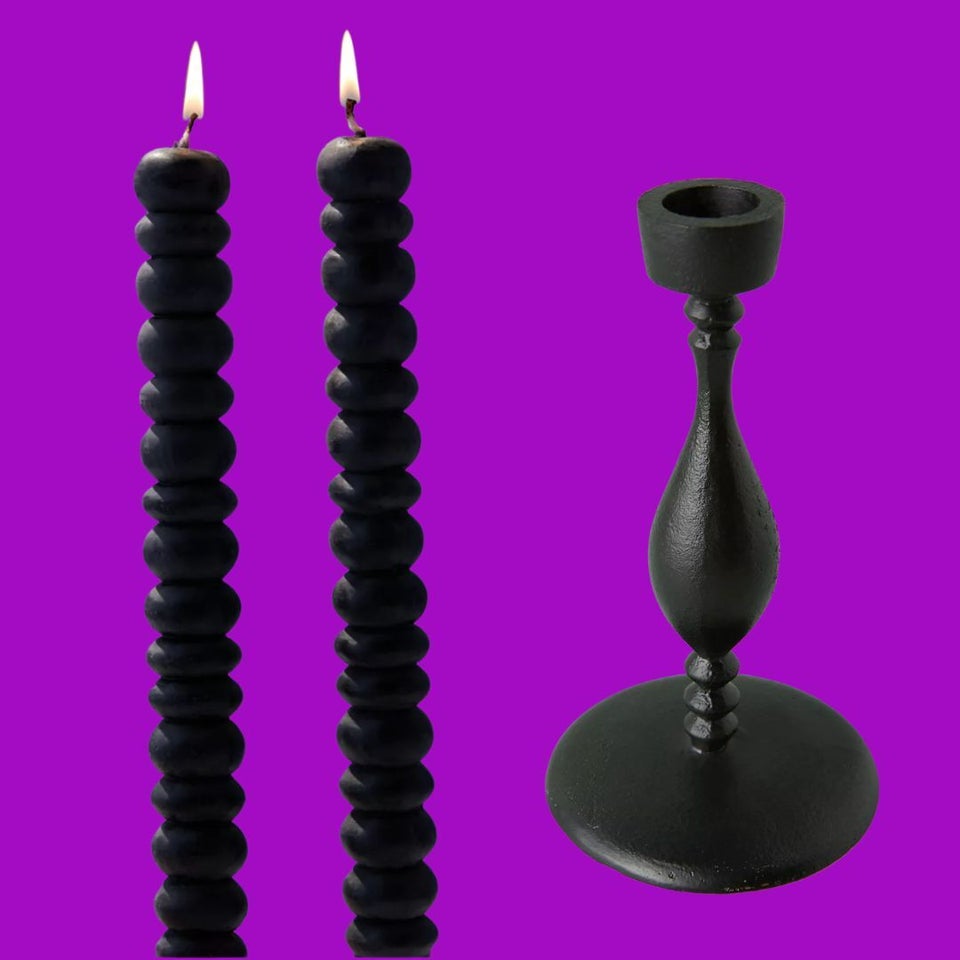 A pair of black bubble taper candles and iron candlestick