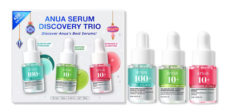 For K‑beauty fans, the Anua Serum Discovery Trio makes it easy to find the formulas your skin will love most. Valued at $36, the set includes the Niacinamide 10 TXA 4 serum, which helps even out skin tone, the Azelaic Acid 10 Hyaluron Redness Soothing serum, designed to calm visible redness, and the PDRN Hyaluronic Acid Capsule 100 serum, packed with salmon PDRN, collagen and hyaluronic acid to lock in moisture and give skin a plump, hydrated look. Each travel-size serum comes in a compact 0.33-ounce bottle, making this set a perfect stocking stuffer.