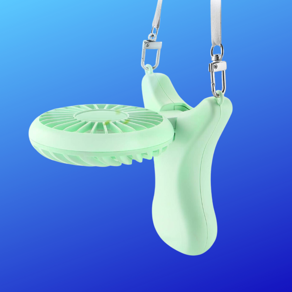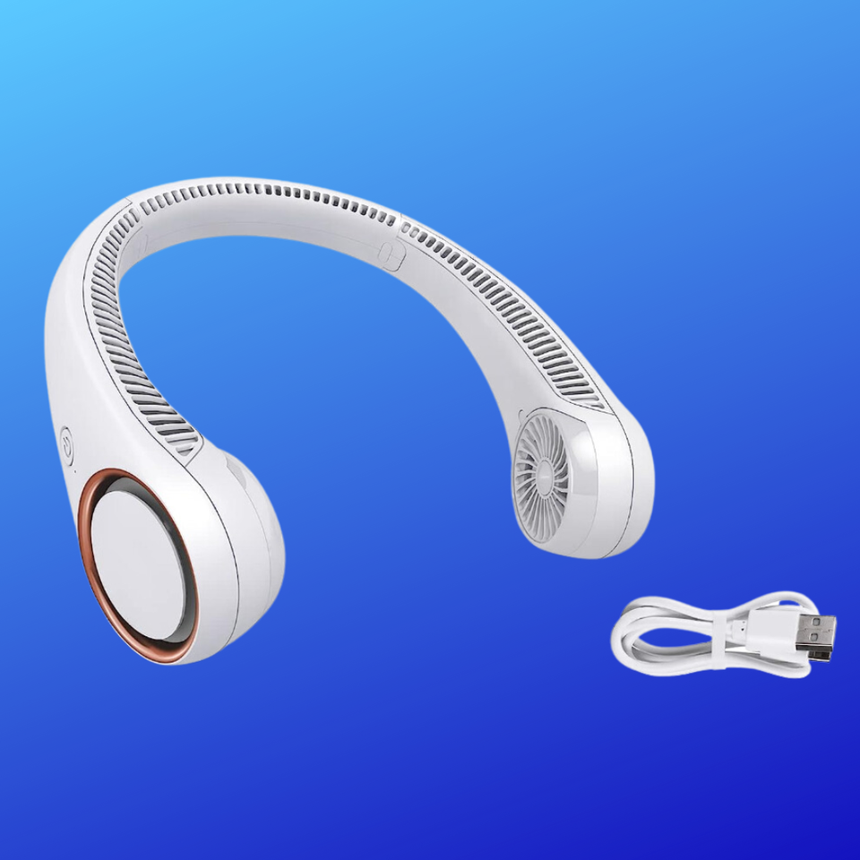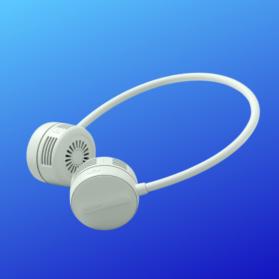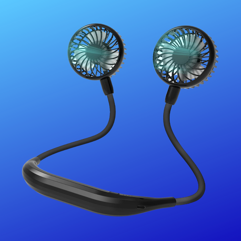 Those with shorter hair might enjoy the strong wind from this portable neck band fan. It has three blades on each fan, is quiet and can be adjusted so you get the blast of air right where you want it. It has three speed options and a long battery life.