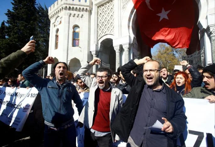 Demonstrators protest the purge of thousands of education staff in front of Istanbul University at Beyazit square in Istanbul, Turkey.