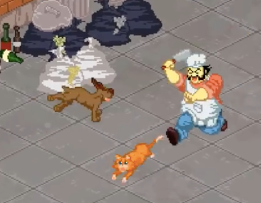 Players score points through saving food costs by dumpster diving and chasing after dogs and cats with a cleaver. Characters in the game also evade taxes and pesky immigration officials.