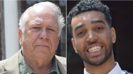First, it uses footage of him doing karate as it lists the "toughest opponents" the U.S. president will have to deal with. (It then moves to footage of what looks to be an Islamic State propaganda video, with a fighter pointing his gun at the camera.) Second, it shows him laughing at a clip of Democratic front-runner Hillary Clinton, who once barked like a dog during a town hall earlier this year.