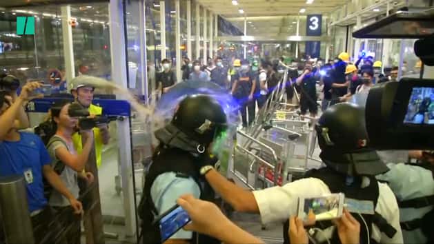 Most of the protesters left the airport Tuesday after officers armed with pepper spray and swinging batons tried to enter the terminal, fighting with demonstrators who barricaded entrances with luggage carts. Riot police clashed briefly with the demonstrators, leading to several injuries and prompting at least one officer to draw a handgun on his assailants.