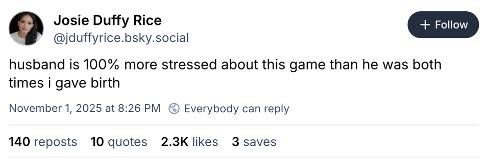 'Husband is 100% more stressed about this game than he was both times I gave birth'