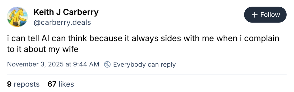 Relationships are full of highs, lows and a whole bunch of ordinary, mundane moments in between. Somehow, couples on X, Bluesky and Threads continue to find humor in the minutiae of being in love.