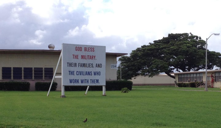The group's founder, Mikey Weinstein, told the Honolulu Star-Advertiser the sign stands out "like a tarantula on a wedding cake." His group, which now represents 65 active-duty Marines at the base, recommends the sign be moved to the base chapel or removed altogether.
