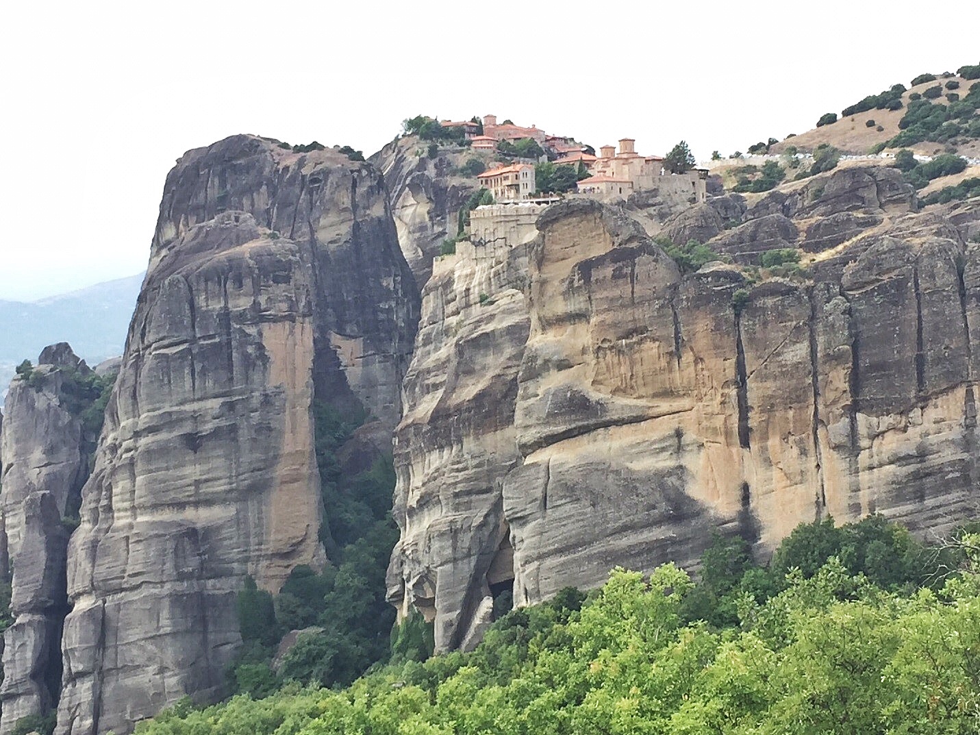 After a few days in Athens, we set off on a road trip my mom had arranged to some town called Meteora. The countryside during the drive was non-descript and we arrived within a few hours. Driving into town, we were immediately greeted by a rocky terrain. As we turned a corner along the windy road, I gasped at the sight that came into view. Soaring to the sky were these imposing rocks, and clinging to the edge were beautiful buildings. We turned another corner and I spotted another stunning structure perched on top. I was looking at several monasteries built on what was natural sandstone rock pillars. From afar, the monasteries appeared tiny as they clung for dear life to the rocks, and the whole area felt mystical and fairy-tale like.