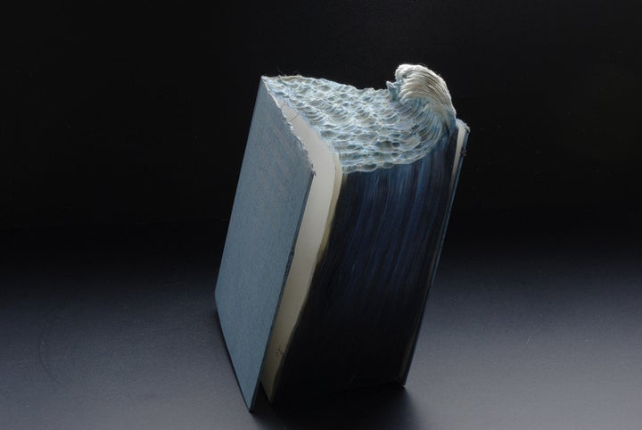 Laramee carves the edges of vintage books, dictionaries and encyclopedias into mountainous landscapes, tsunamis and incredible waves.