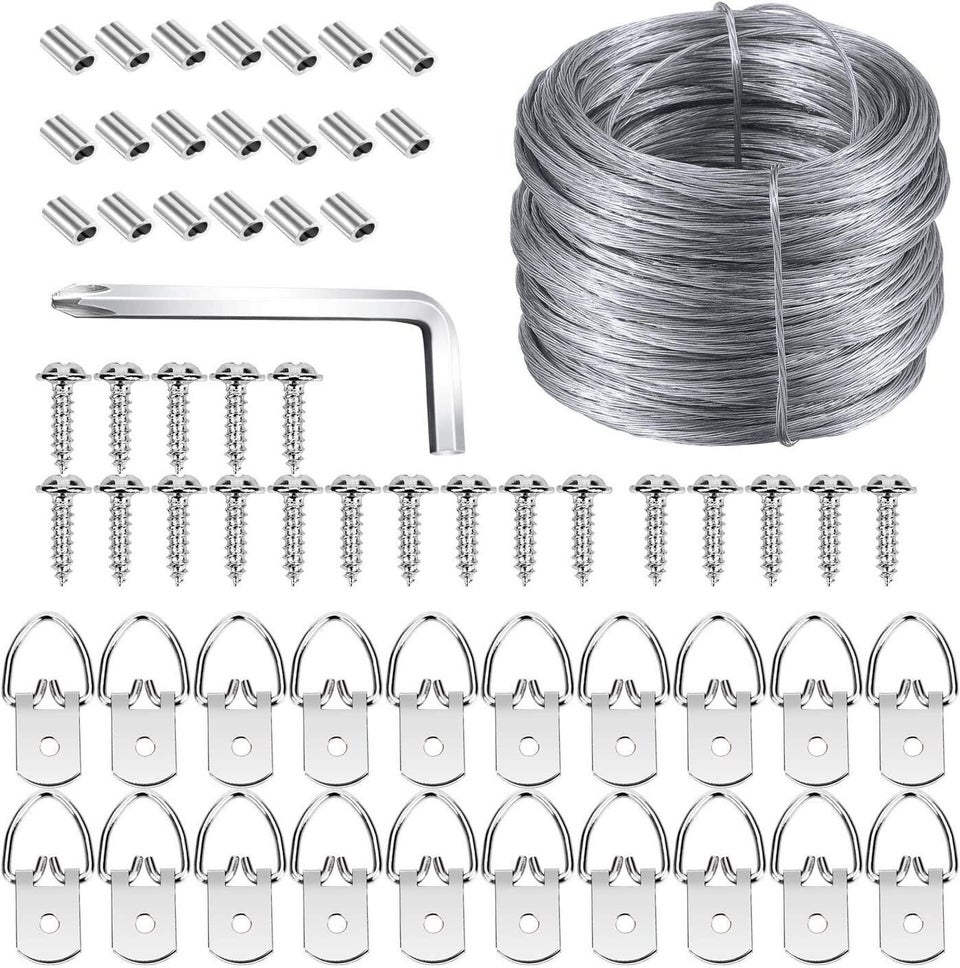 If your frame doesn't have any hooks or wire on the back, you’ll have to add them yourself. It's really not as hard as it sounds, and is even easier with this kit that contains everything you need, even a mini screwdriver. (If your frame has D-rings attached already, but you still need hanging material, you can also buy just the wire.)