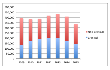 Department of Homeland Security, Yearbook of Immigration Statistics 2015, table 41. Criminal means has prior criminal conviction.