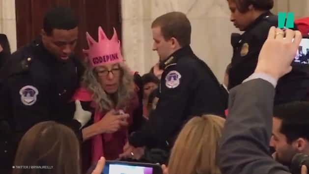 “Why am I being taken out of here?” Fairooz asked. “I was going to be quiet, and now you’re going to have me arrested? For what?” Fairooz also referred to Sessions’ record as “evil,” Shelby’s comment as “ridiculous,” and appeared to hold up her sign, which could violate the ban on picketing.