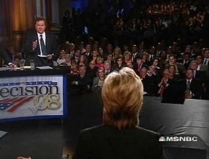 Glynnis (9:26:02 PM): Russert repeats the question three times to Hillary but lets the other candidates off the hook after they give similar answers.