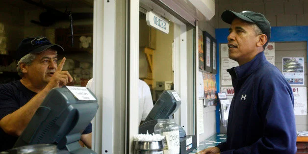 Obama told staff at the counter: "Good to see you man, thanks for feeding us." (The pool report confirms that Obama ordered fried shrimp, fried oysters, onion rings and French fries. Sounds good to us!) He then stepped inside to take photographs with Nancy's staff before returning to his car.