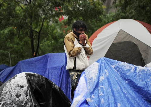Protesters camped out in Zuccotti Park contended with snow, wind, rain and unseasonably cold temperatures for the first time Saturday as the Occupy Wall Street movement began its seventh week in New York.