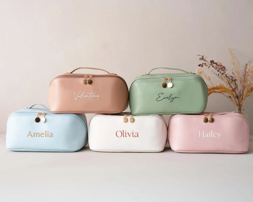 A vegan leather cosmetics bag with an embroidered name