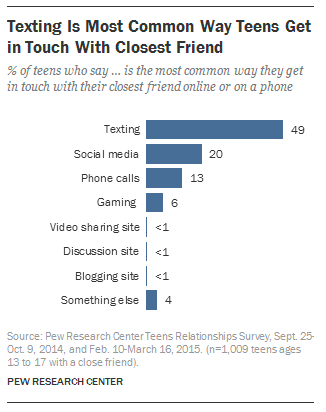 Pew also found that texting and social media were woven into this fabric of the participants' constant communications. Indeed, while more than 55 percent said they text every day, a much smaller group (19 percent) said they call their friends on the phone daily. For 49 percent, texting was the most common way they were in touch with their best friend.