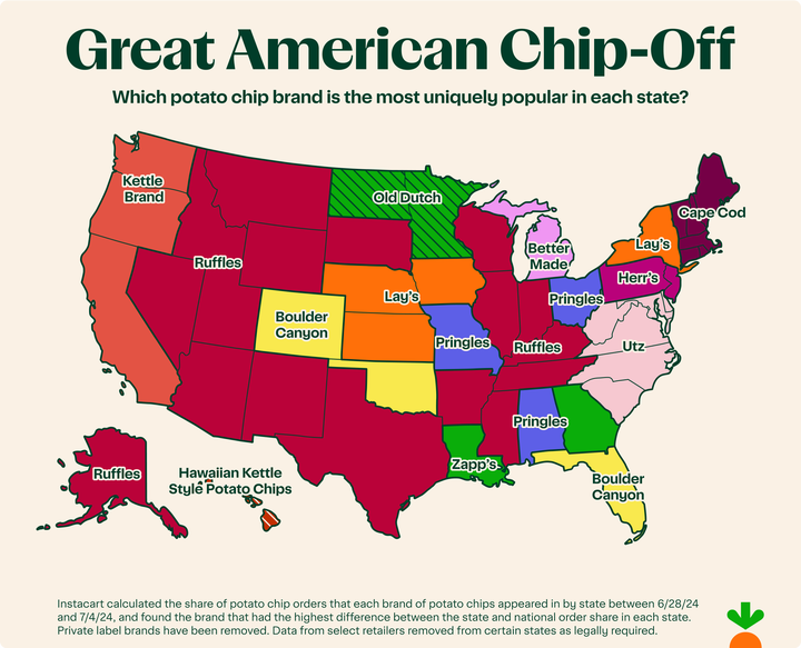 Instacart’s analysis reflects the brands that had the highest difference between the state and national order share in each state, based on potato chip orders between June 28 and July 4, 2024.