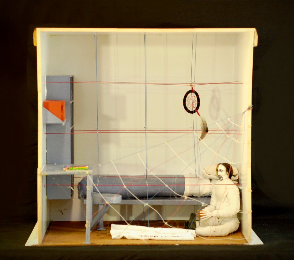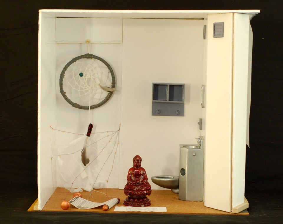 So, while Cone’s spiral of literary tomes illustrates his desired escape, others create homages to their budding religious lives. One of the exhibit’s pieces, a model built by Derrick Quintero, depicts a prison cell adorned with a dreamcatcher, scroll and Buddhist sculpture.