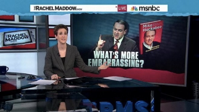 Maddow was busy conducting her first ever instant viewer poll, centered on the question, "what's more embarrassing?" She first talked about Huckabee's recent statements that President Obama grew up in Kenya, and his comment that Natalie Portman's very public pregnancy was "glamori[zing]" the usually tragic situation of giving birth while not married.