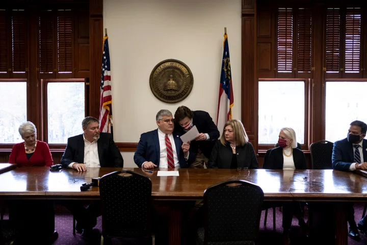 Brad Carver wound up signing the false certification that he was among the “duly elected and qualified” Electoral College electors on Dec. 14, 2020, when four out of the 16 in Trump’s designated slate failed to show up at the appointed time and Carver stepped in for one of them. The actions of the 16 signatories are now under review by the U.S. Department of Justice and, potentially, the district attorney of Fulton County, where the Trump electors staged a ceremony to sign the paperwork they then sent up to Congress and the National Archives.