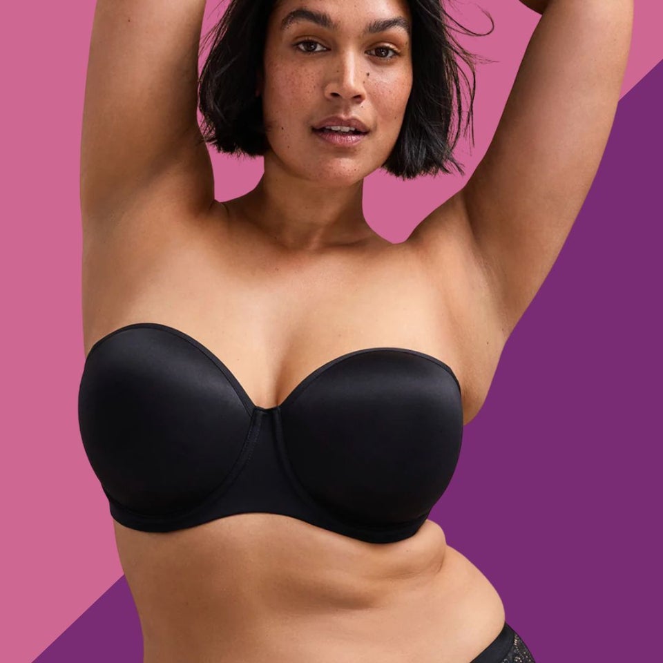 Third Love is one of the few bra companies that offers half cup sizes with options up to an H cup. Their 24/7 classic strapless bra claims to never fall down, maintain a smooth profile and features soft, supportive foam cups. It's available in both nude and black and also comes with detachable and convertible straps.