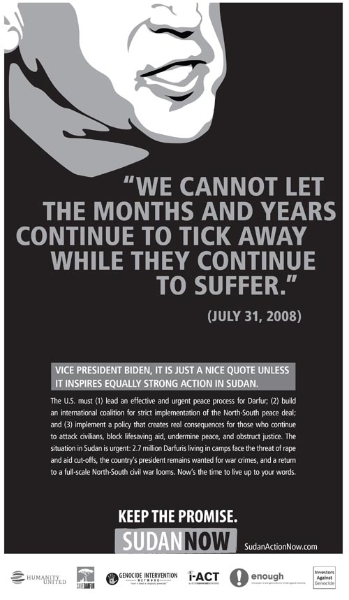 As part of the campaign's launch, a series of print and online advertisements are appearing in national publications. The advertisements feature statements made by President Obama, Vice President Biden, and Secretary of State Clinton, which focused on applying "real pressure" to the government of Sudan. (Check out all the ads here, here, here, and here.) In sharp contrast, the U.S. administration's current approach seems to favor incentives and concessions over strong, comprehensive action.