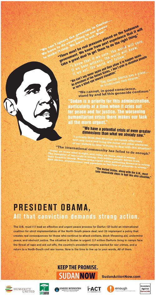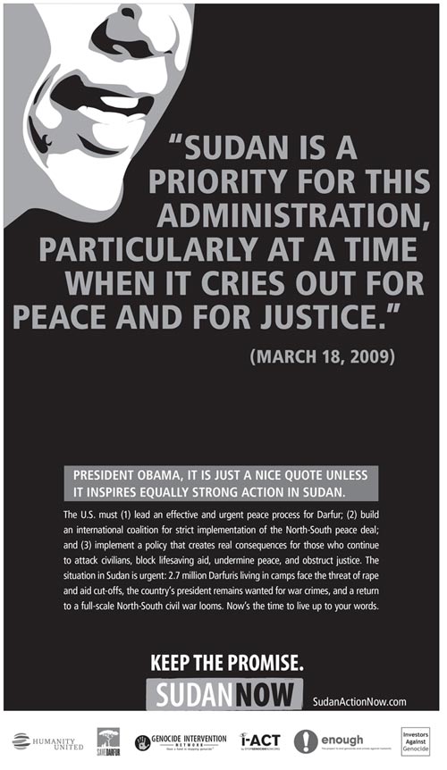 Yesterday, a coalition of anti-genocide advocacy organizations announced the launch of a bold new campaign called Sudan Now: Keep the Promise. The campaign challenges President Barack Obama and top U.S. administration officials to live up to their campaign and political promises by taking strong and immediate action to help end the international crisis in Sudan and bring a lasting peace to the people of that country. Members of the coalition include Humanity United, the Enough Project, Stop Genocide Now, and Investors Against Genocide.