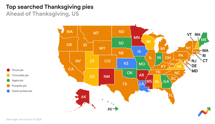 The folks at Google put together a map breaking down the top-searched Thanksgiving pies in every state. Drawing from searches between Oct. 13 and Nov. 13, the analytics show that pumpkin pie dominated in most states ― but there were were also plenty of places where pecan pie, chocolate pie, apple pie and sweet potato pie got some love.