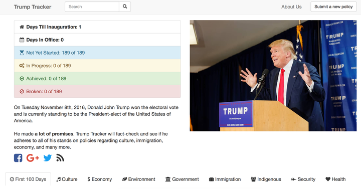 The world may be keeping an eye on the transfer of power on Friday, January 20, but from 10:31 AM when the Trump administration takes over, the internet is going to be keeping score of the administration. The slew of President Elect Trump’s promises on the campaign trail created enough fire to propel him to office, and now, several projects on the internet exist to validate Trump’s policy making and promises. Trump Tracker is one of those projects, using a unique combination of open source tools to make tracking Trump’s political movements easier.