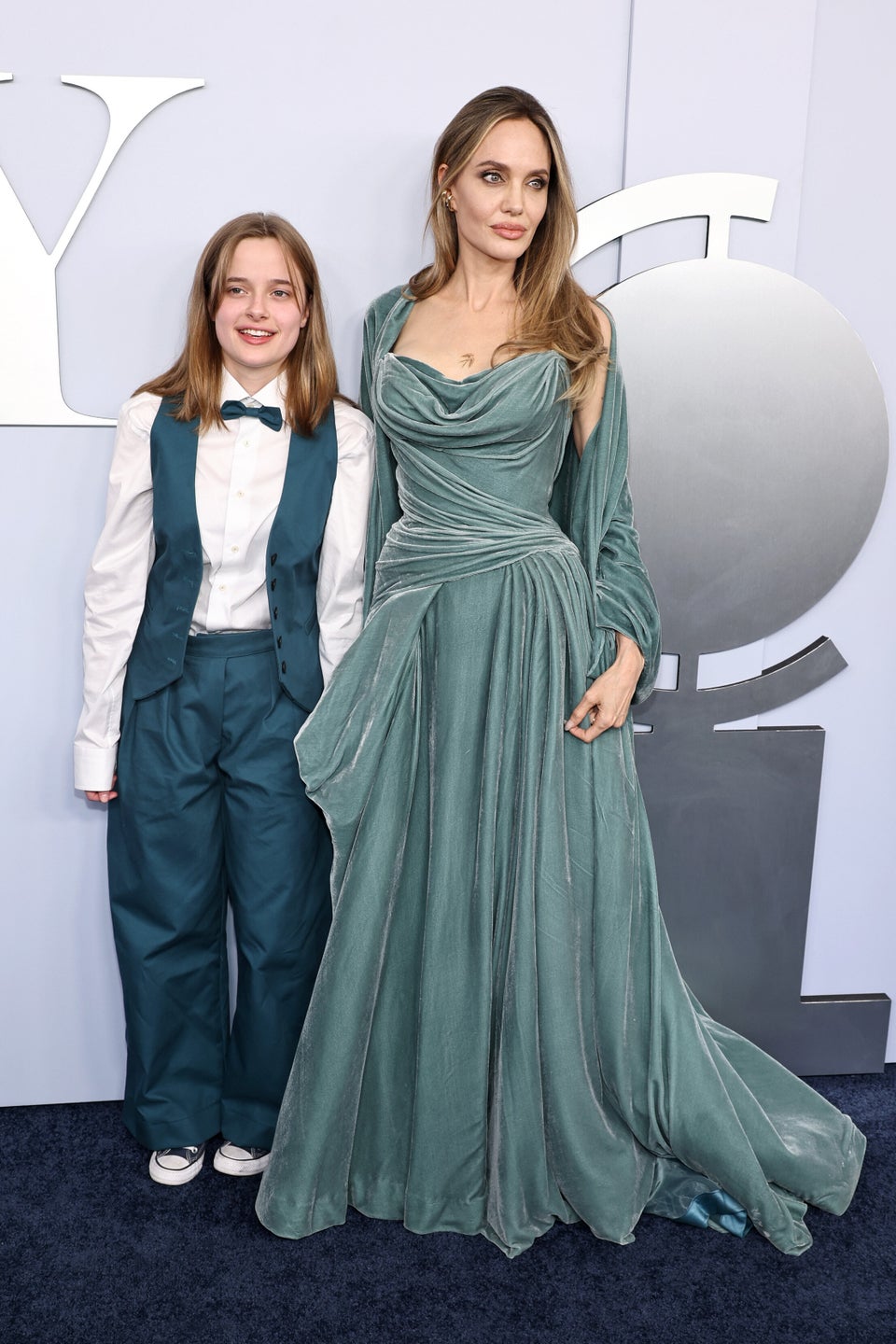 Angelina Jolie was joined by daughter Vivienne Jolie-Pitt on the red carpet, where she wore an Atelier Versace gown designed in draping teal velvet. The mother-daughter duo helped produce the stage adaptation of “The Outsiders.”