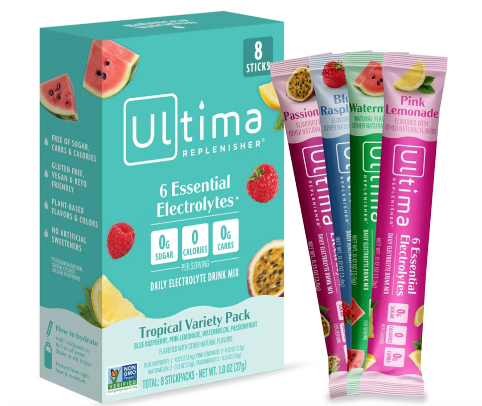 Each packet of Ultima Replenisher's electrolyte mix contains magnesium, calcium, potassium, chloride, sodium, and phosphorus, along with vitamin C and zinc, to help revitalize the body, keeping it fully alert and hydrated – even in the ultra-dry plane environment. The tropical variety pack comes with eight stick packages in flavors blue raspberry, pink lemonade, watermelon, and passionfruit.