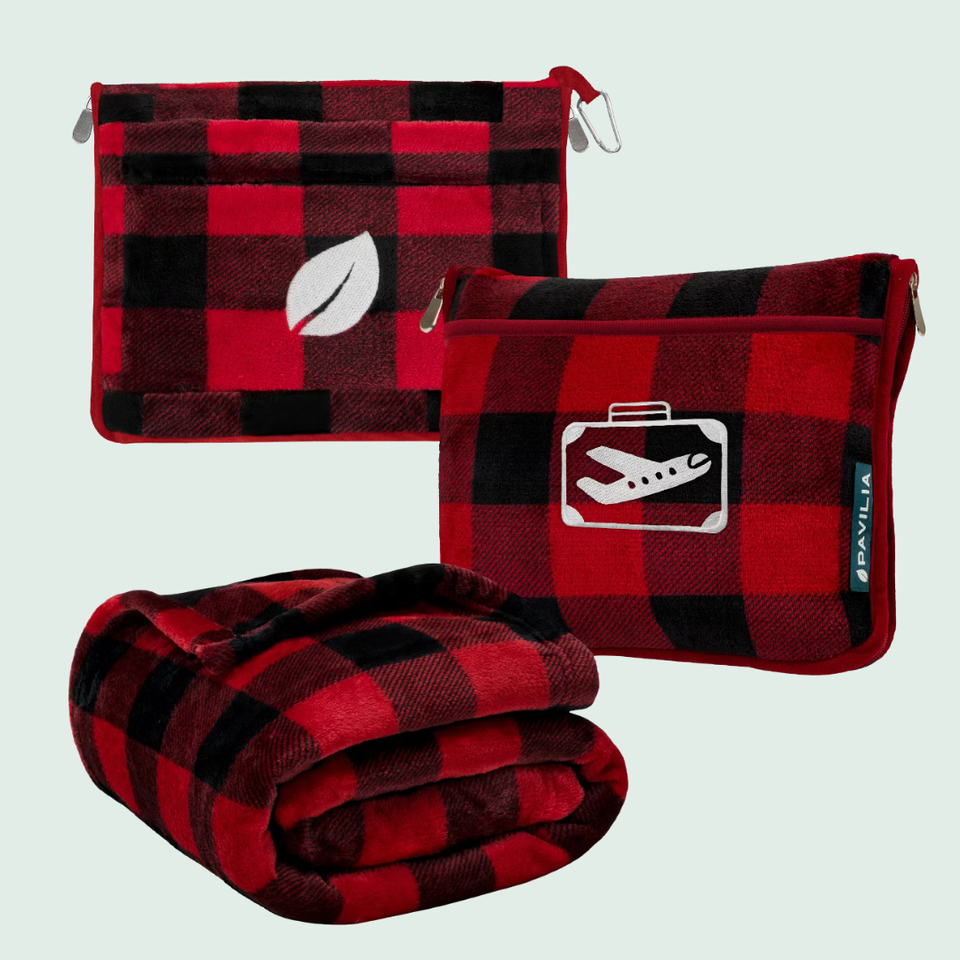If you pack this premium microfleece blanket and pillow in your bag, you'll be prepared for a warm and comfortable flight. The compact design allows you to bring both the pillow and blanket in your carry-on bags or attach them to your suitcase for convenience. The microfiber material is designed to have a soft, plush feel that provides comfort while retaining heat. The travel blanket comes in one 65-by-40-inch size and is available in a checkered red, gray, and black.